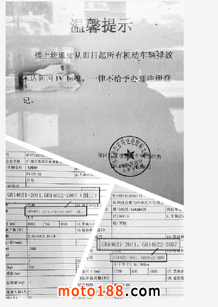 核心提示:近日,帶著新車前往清遠(yuǎn)佛岡車管所入戶的陳先生遇到了尷尬事。上級(jí)最新文件要求,機(jī)動(dòng)車排放標(biāo)準(zhǔn)升級(jí)為國(guó)Ⅳ,他的國(guó)Ⅲ摩托車上牌