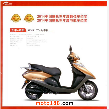 2014年11月重慶摩博會上,中國摩托車行業最高獎項評選結果隆重揭曉。中國汽車工業協會摩托車分會、國家摩托車質量監督檢驗中心、11家摩托車行業主流媒體與參會摩友共同見證,五羊-本田睿御110一舉獲得“2014中國摩托車年度最佳車型獎”、“2014中國摩托車年度節能車型獎”兩項重磅大獎!??