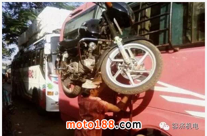 沒有任何的支撐,就這樣用頭頂著,雙手扶著階梯慢慢的上去,大家都知道摩托車的重量,不服的騎士可以自己試驗(yàn)!