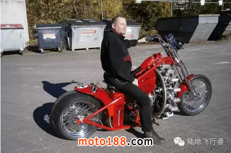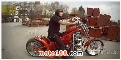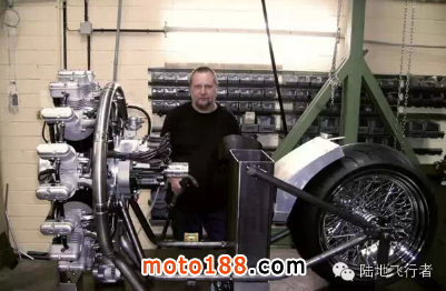 這個150馬力Rotec-Radial的R3600飛機引擎,Frank Ohle為自己動手組裝的這臺很猛的Chopper重機車起名叫Red-Baron紅男爵。阿彌陀佛!他接下來還打算給機車加裝上一雙翅膀然后從懸崖或者峽谷飛出去。