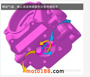 裝配螺旋氣道,偏心渦流燃燒室的分層燃燒技術,為摩托車發動機提供合適的燃油,使其發揮最大動力。火花塞附近混合氣濃度適宜,易點燃,且啟動性能好,爆發力強。離火花塞較遠的區域汽油濃度最低,但是通過前面的燃燒氣體的擠壓和加熱,稀薄的燃燒氣體也易于充分燃燒。