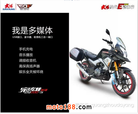 核心提示: 大陽梟雄DY200-5旅行版摩托車集手機充電、音樂播放、調(diào)頻收音機、高保真楊聲器于一身 當你在網(wǎng)上沖浪手機木有電時,梟雄能