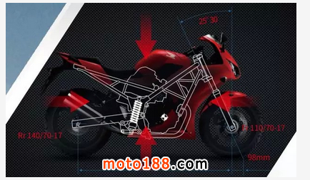 為了降低發動機的摩擦阻力減少油耗,在氣門機構中,采用了通過軸承與凸輪接觸的滾子搖臂,并在活塞表面施以用于提升機油保持性能的花紋活塞鍍層;應用以降低活塞與汽缸間摩擦的偏置曲柄,CBR300R實現了優異的高效表現,百公里油耗僅2.94L。