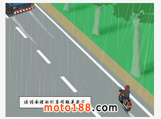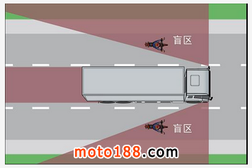 摩托車在道路上行駛應(yīng)盡可能避開(kāi)大型車輛。大型車輛因高度和長(zhǎng)度的關(guān)系,會(huì)在車輛周邊產(chǎn)生一定的視覺(jué)盲區(qū),一旦大型車輛突然變更車道或緊急剎車,極易引發(fā)交通事故。另外,大型車輛快速通行時(shí),形成的氣流會(huì)對(duì)周邊較近的物體產(chǎn)生一定的吸力作用,如摩托車靠得太近,則易引發(fā)被卷入車底的交通事故。