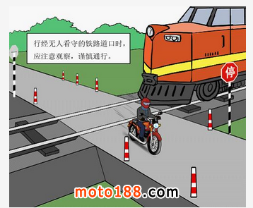 (4)行經(jīng)無(wú)人看守的鐵路道口時(shí),應(yīng)做到“一停、二看、三通過(guò)”,禁止在道口內(nèi)停車;行經(jīng)有人看守的鐵路道口時(shí),應(yīng)服從道口管理人員的指揮,在欄桿開(kāi)始下降時(shí),禁止強(qiáng)行闖桿,與火車搶行。