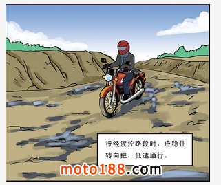 (6)行經(jīng)泥濘路段時(shí),應(yīng)選用適當(dāng)擋位,保持足夠的動(dòng)力,穩(wěn)住轉(zhuǎn)向把,均勻一次性通過(guò)。通過(guò)長(zhǎng)泥濘路段時(shí),應(yīng)中途停車熄火休息,以防止發(fā)動(dòng)機(jī)溫度過(guò)高。通過(guò)泥濘路段時(shí),應(yīng)停止加油,必要時(shí)下車推離泥濘路段,否則車輛會(huì)陷入泥潭,不斷打滑。