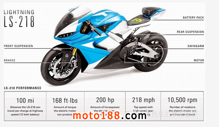 該廠量產的頂級性能電動摩托車是LS-218,最大動力輸出200hp,峰值扭矩168ft-lb,百公里加速3秒內,極速218英里/小時(348.8千米/小時),續航160千米,全車僅重222.75千克,可選配前后Ohlins懸掛,標配Brembo剎車,鎂合金輪轂,電動機最高轉速可以達到驚人的10500轉/每分鐘。