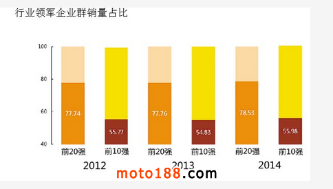 近3年的產銷數(shù)據(jù)表明,銷量前10名的企業(yè),銷量占比僅由2012年的55.27%提升至2014年的55.98%;銷量前20名的企業(yè),銷量占比僅由2012年的77.74%提升至2014年的78.58%;數(shù)據(jù)變化微乎其微。