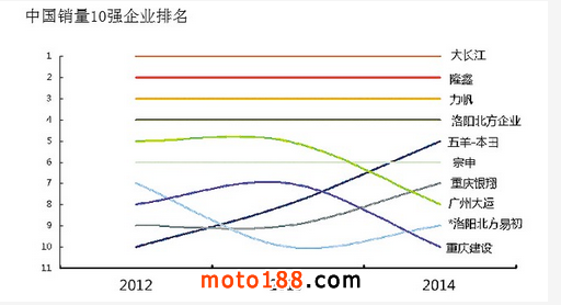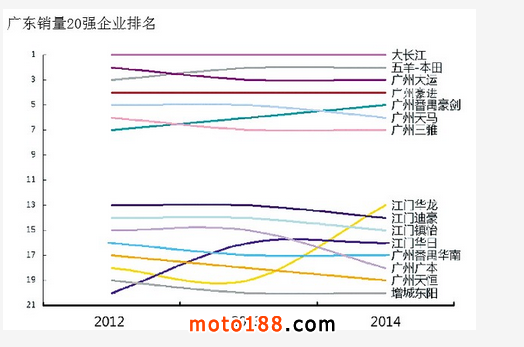 以廣東板塊為例,在前8名的競爭中,五羊-本田超越廣州大運,躍居第二;豪劍連續(xù)兩年超越三雅、天馬,躍居第5.在追趕者梯隊中,江門華龍由第18名,連續(xù)跳躍,坐上了第13名的位置。2014年,江門華龍的銷量達到了78284臺。