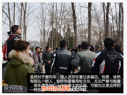 而對于車迷們來說,意大利則一個夢幻般的天堂。法拉利、蘭博基尼、瑪莎拉蒂等一個個耳熟能詳的名字,便源自于此。當然,還有那些歷史同樣悠久的摩托車,雖然這在國內仍屬于“小眾”文化,雖然對于摩托車,國人還存在著過多偏見。但是,依然有那么一群人,他們始終熱愛著“兩輪”文化,無論嚴寒與酷暑,“騎車”便是他們人生中的一大樂事。可能也正是這樣的一種執著,才將他們聚集在了一起。