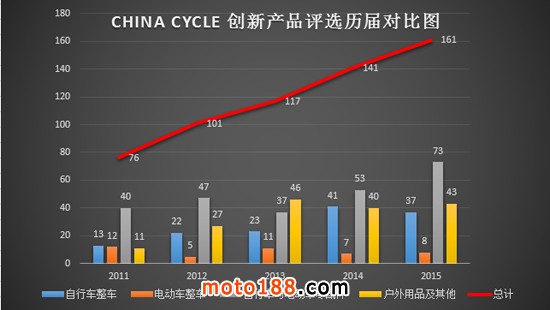 本屆創新產品評選活動自2014年11月20日起開始報名,向參加“2015中國展”的參展商征集近年來創新產品,在為期3個月的時間里,共收到161件參評產品,其中自行車整車37件,電動車整車8件,自行車、電動車零部件73件,戶外用品(騎行裝備)43件,報名數量與上屆相比增長14%。