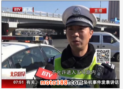 之后北京公安局公安交通管理局豐臺交通支隊方莊隊的執法警官昝玉貴同志,在接受媒體采訪時說京B號牌摩托車,不允許進入五環路內。