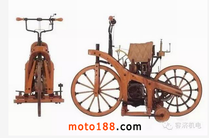 1885年,德國巴德康斯塔特市,當戴姆勒將一臺汽油發動機裝載到一輛兩輪車上時,世界上第一輛以汽油為燃料的動力摩托車誕生了,而這輛摩托的大部分材料卻是木頭。