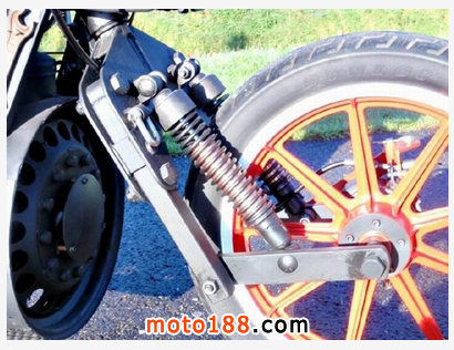 加個(gè)鳴鐘和汽笛就更是無法不讓人想起火車,而它的摩托車特色裝置在前半部分。在它的前半身裝了兩個(gè)減震器連著轉(zhuǎn)向輪,拖拽式結(jié)構(gòu),鼓式剎車。