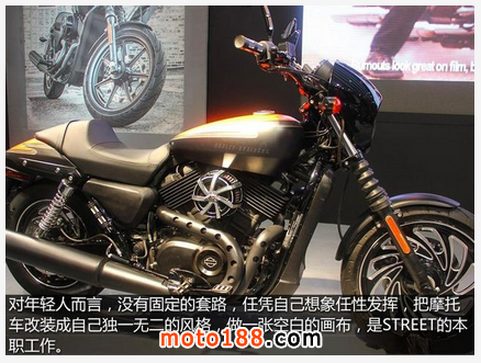 的確,一款面向年輕人的車型,“哈雷大叔”還是不要太“自作多情”為好,提供一個好胚子,不必要的裝飾都省下來,把價錢拉低,省下的錢就交給車主自己去發揮吧。當然,為了挑逗未來車主的欲望,哈雷還是為新車準備了三款由哈雷美國總部Willie G.Davidson設計中心設計師親自操刀的STREET改裝車,這三款被命名為RDX800、Urban Custom以及Project Garage的作品,設計靈感分別來自賽車、歐洲藝術范兒、日本頹廢風格。這幾個示范改裝方案,增添了年輕人對于新車的信心。