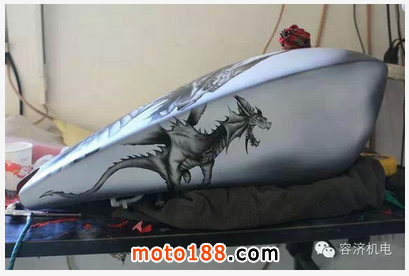 一個小小的油箱上,龍是活著的,并且如此淋漓盡致,當龍跟摩托車結合在一起的時候,就是一件活著的藝術品。彩繪的過程是痛苦的,新入手的愛車為了披上美麗的外衣,被拆的七零八落。油箱上面的彩繪,打掉原漆的時候,手顫抖了。。。。。。
