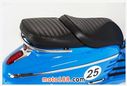 運動版車身顏色為運動韻味十足的愛琴海藍,配置單人運動型鞍座,車身有25號碼標(biāo)貼圖樣。25號是對標(biāo)致具有歷史紀(jì)念意義的冠軍戰(zhàn)車編號。