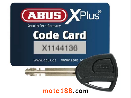 ABUS X-Plus系列的鑰匙也是一大亮點,它標配一大一小兩把鑰匙以及一個鑰匙卡,小鑰匙通常作為備用,大鑰匙為主力且鑰匙上配備了一個藍光小燈,方便車主在光線昏暗的情況更快、更準的找到鎖孔,非常人性化。鑰匙卡則是為丟失鑰匙準備的,即使兩把鑰匙全部丟失,你也可以憑借鑰匙卡上的唯一代碼找到授權經銷商重新配新的鑰匙。