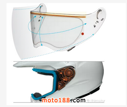 V-460的創新功能是快速拆卸功能,易于操作的直角回轉螺絲可以快速拆卸遮陽沿,無需特殊工具。而且全新百葉設計遮陽沿,使其重量低于同級別其他頭盔。