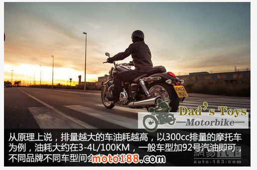 從原理上來說,排量越大的車油耗水平會越高。我們以300cc排量的摩托車為例子,油耗大約在3-4L/100km,一般車型采用92號汽油,一箱油大約在100元左右,可以跑大約300-400公里,當然,不同品牌不同車型間會有一些差異,但車身較輕負擔較小的摩托車大約能比汽車節省一半以上的燃油費用。