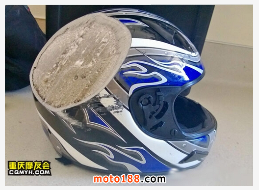 這張圖片應該大家都有印象吧,這是在以時速70mph,約112km/h發生事故,頭盔在地上滑行的慘狀。如果用劣質的安全帽,其實跟沒帶是一樣的效果。