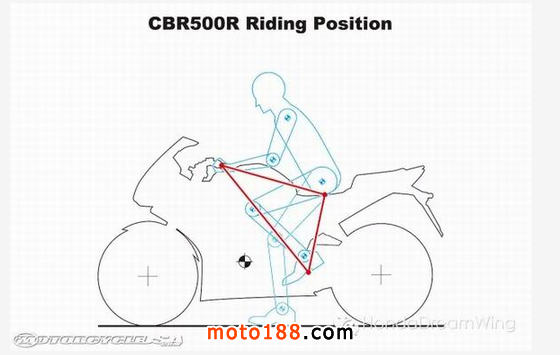 CBR500R看上去正是一臺中量級的運動型摩托車,相比之下讓小兄弟CBR250R看起來小了不少。較大的輪胎—120/70前胎和160/60后胎,塑造了CB500車系的重型車的感覺。靠后而直立的坐姿給車手以放松的駕駛感,腳踏距離坐墊的距離更長,遠不像CBR250或Ninja300那樣蜷縮。它是一部很舒適的中量級車,就像同級別的川崎或者鈴木的雙缸650。