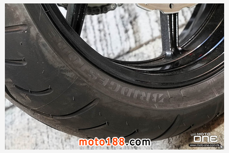●310mm雙鉆孔碟配四活塞煞車卡鉗,新車配備新款BRIDGESTONE T30輪胎。