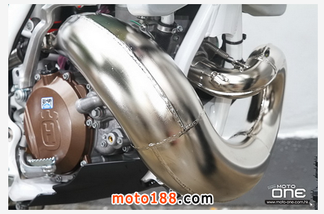 ●水冷二沖程單汽缸293.2c.c.引擎,排氣管的超粗排氣膨脹室是2沖車與4沖車在外型上最大的分別。