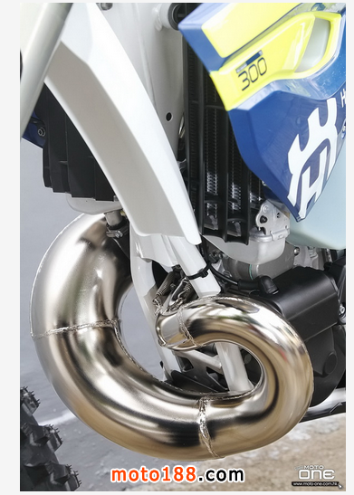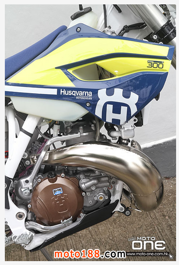 Husqvarna TE300挾54ps馬力峰值傲視云云對手,比TE250多岀50c.c.,馬力與扭力高出相當,但竟然只有104.4kg的車子乾重,僅比前者多出 0.2kg,秘密在那里?其實沒有秘密,只是大量采用剛度適中的輕合金,除了那鉻鉬合金車架,大概可以包括稱之為高拉力鋼管車架吧。當然是非一般鋼管,這 個在TE250文 中己介紹過,在此不再重提,現在就著眼於她的乾重,證明在開發TE250時,各零部件已預留充裕的強度去應對更大馬力/扭力的輸出,主要的零部件無需作出 改動去迎合,只是汽缸孔徑改動72mm,活塞行程維持TE250的72mm,即72x72mm缸徑/活塞行程以1:1比例實屬罕見。