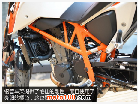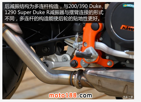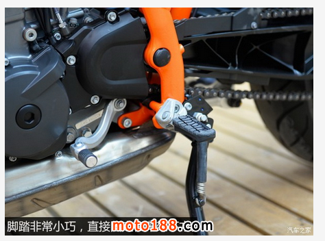 至于操控性,它騎起來(lái)不太像是騎著一輛大排量摩托車(chē)。輕量化是這輛車(chē)的最大優(yōu)勢(shì),它的鋼管車(chē)架只有9kg重而已,鋁合金后擺臂只有4kg,看得出來(lái)KTM對(duì)于車(chē)重的控制非常有一套。而單缸發(fā)動(dòng)機(jī)體積較小,曲軸長(zhǎng)度較短,所以發(fā)動(dòng)機(jī)運(yùn)轉(zhuǎn)的慣性也比較小,所以在傾倒車(chē)身準(zhǔn)備過(guò)彎的時(shí)候,你會(huì)覺(jué)得車(chē)身動(dòng)態(tài)非常的自然迅速,沒(méi)有什么費(fèi)勁的地方。