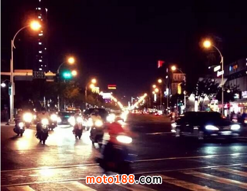 入夜,站在人行天橋上,遠眺“機車陣”光影照人,小巧靈活的機車穿梭在汽車間,分外顯眼。
