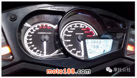 其次,儀表右下角液晶屏面積不大,顯示數據卻不少,一眼看過去,有點亂。轉速表和速度表占據了儀表盤的主要位置,但是數字標示既密集又很小,人湊到跟前都不能一目了然,更別提在行駛中了。實際騎行中,轉速表還好大概估計一下,速度表如果你不是非常熟悉這個表盤,那就是完全不可能看清楚速度顯示。