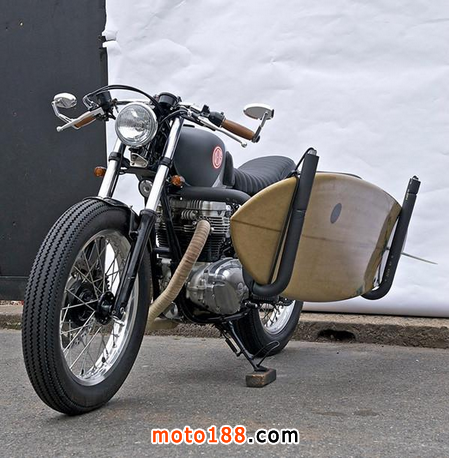 這款摩托車并不算是強壯肌肉型,它是為沖浪人群專門設(shè)計的,澳大利亞的陽光沙灘才是它的終點。它的外形在描述著浪花,也是簡潔大方的代名詞,還可以定制貼心的沖浪板支架。深紋路輪胎減震性能良好, deus ex-machina的設(shè)計師們也用一個循環(huán)式汽化器代替了車上所有的空氣通風(fēng)系統(tǒng)。