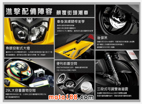 核心提示: 2015年全新的 BW'S R 125 以前衛驃悍姿態強勢登陸,此車承襲了BWS 獨特的 Off-Road 外觀,并將經典雙頭燈再度進化。魚眼投射