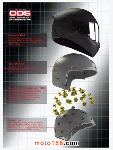 他們想摩托車可以有減震系統,那為什么頭盔里面不能擁有像摩托車那樣的減震系統來提供頭盔內部的吸震功能呢?圍繞著這個出發點,他們開發了一款ODS全方位吸震懸掛系統,并將其試應用在他們自家的頂級越野頭盔ATR-1當中。就在前不久他們開始面向公路頭盔開發了一款頂級公路頭盔ATS-1,并且將同樣的ODS全方位吸震結構應用到其中。