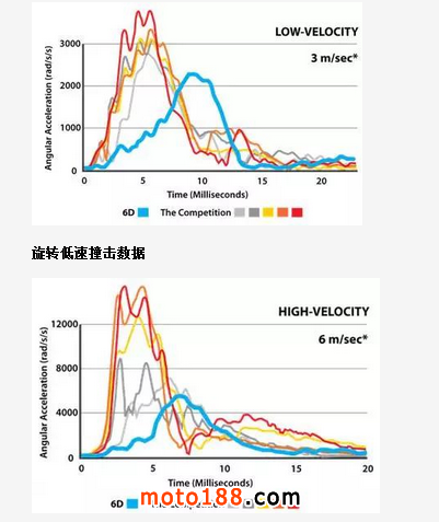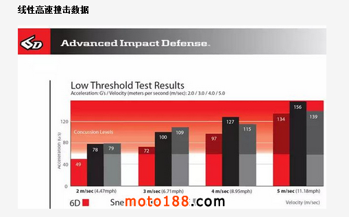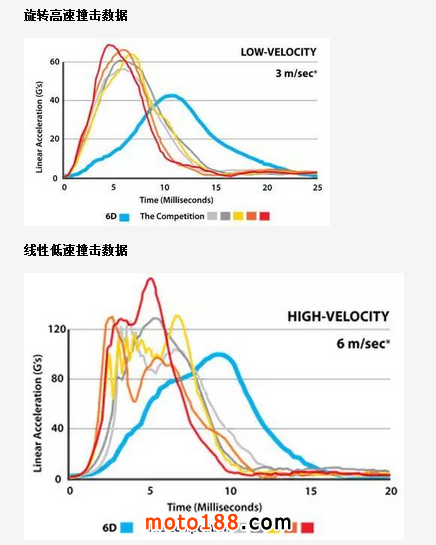 通過數據我們可以看出沖擊力所帶來的加速度均比普通頭盔要來的低很多,均勻的被吸收分布在接受撞擊的時間當中。并且“6D”的安全性能測試均明顯高于DOT/SNELL、ECE等標準,證明了這個頭盔廠商制造出來的獨特頭盔確實很可靠,而且這個概念的越野頭盔已經裝備到專業車隊了。