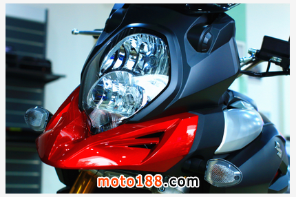 2014款V-Strom 1000延續鈴木GSX1300R-HAYABUSA“隼”堆疊式大燈設計,近光、遠光、駐車燈由上至下依次縱列。