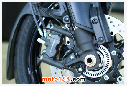 2014款V-Strom 1000前制動采用雙浮動盤東機工(Tokico)對向四活塞輻射式雙卡鉗,后制動配置東機工單活塞卡鉗,博世(Bosch)ABS防抱死系統為標配。