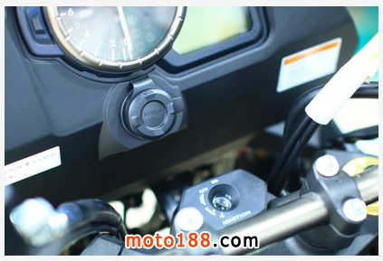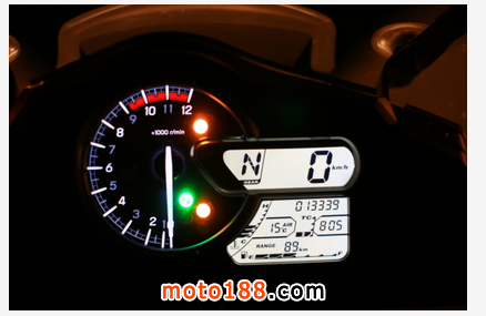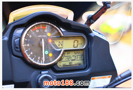 2014款V-Strom 1000的儀表板顯示信息量非常全面,超大指針式轉速表結合數顯時速表,可在不經意間洞察速度、轉速的細微變化。TC(牽引力工作狀態)、空擋、電噴自檢、低溫警示(低于3℃)、遠光、檔位、機油、防凍液、TC模式選擇、大氣溫度、時鐘、防凍液溫度(量化顯示)、綜合油耗、瞬間油耗、總里程、短里程、電壓等顯示數據一應俱全。儀表板左側為儀表控制按鍵(Reset),儀表顯示六級儀表亮度控制擁有極佳的辨識度而且科技感十足。
