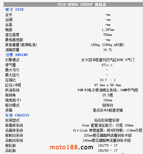 核心提示: ●2016 HONDA CB500F的配色很HONDA的HRC味。 HONDA發布2016年新款大包圍CBR500R后,隨即宣布將會推出NK版的CB500F。相比上
