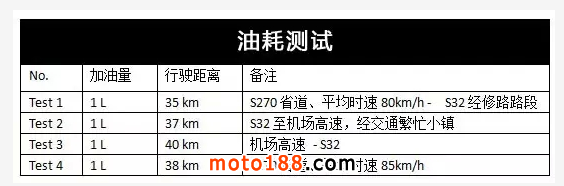 為了更準(zhǔn)確地測試實際行駛中的油耗,我們在出發(fā)前抽空摩托車郵箱,并加注1L燃油。MARCO在保持約80km/h的平均速度騎行45公里后耗完第一升油。緊接著加注的第二升油行駛了47公里,第三升油行駛了50公里,第四升油行駛了48公里。LYRA再次突出地表現(xiàn)出了彎梁車“省油”的優(yōu)越性。