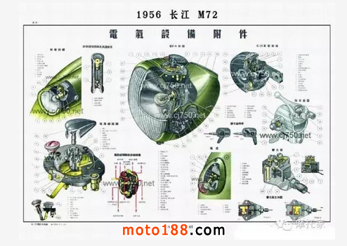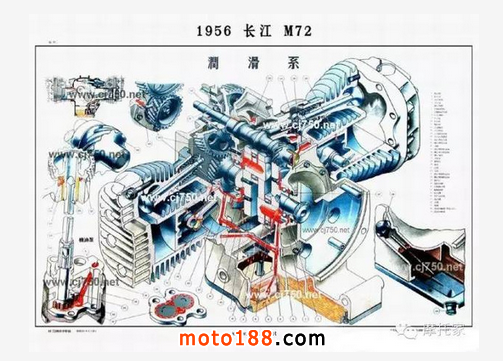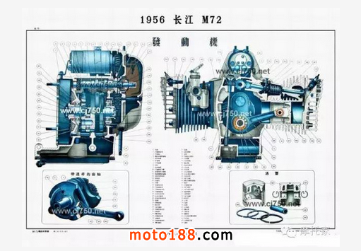 好了,開始講長江750的歷史。20世紀50年代,在蘇聯“老大哥”的支援下,我國參照烏拉爾T-72生產造出了我國自己的長江750M1型摩托車。當時只知道仿制的是蘇聯烏拉爾M72,沒有圖紙,只好采取土辦法——拆,把樣車零件統統拆下來,然后實物測繪。光測繪畫圖紙就用于近3個月,整車完成共651份圖紙,車體部分圖紙編號1308A4,發動機部分圖紙編號1800A4。