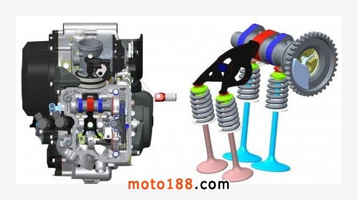 先來說說這臺代號為LC4的單杠大排量發動機,這臺LC4發動機看起來和上一代發動機看起來只有一些細微的差別,但根據KTM方面的消息表示新款引擎上并沒有多少零部件可以和老款共用。LC4發動機最大的變化就集中在了缸蓋部分,已經從上一代發動機的SOHC升級成了DOHC,同時正時鏈條會連接兩個齒輪,但其中只有一個齒輪才真的帶動凸輪軸。原本的單凸輪軸被移植到了進氣門一側,并且通過增加的結構可以同時控制排氣門的開閉,而排氣門一側增加的軸可以看做是平衡軸,為減少發動機的震動做出了不少的幫助。此外缸蓋的材料也從鋁合金材料換成了更輕的鎂合金材料,并且整個缸蓋只用了三個螺栓進行固定,減少的重量非??捎^。