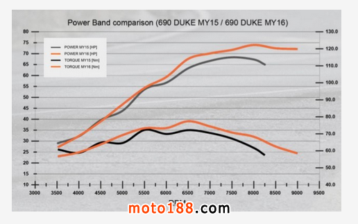 除了缸蓋極其內部的變化之外,LC4發動機的缸體部分也有了一些變化,缸徑增加了3mm達到了105mm,沖程減少了4.5mm增加到了80mm,也就是我們現在看到的擁有693cc的LC4發動機,上一代LC4發動機排量僅有609cc。缸徑的增加也讓活塞頭的體積有所增加,不過整個活塞的重量并沒有變化;連接活塞的曲軸連桿也采用了輕量化的材料以減少轉動慣性提高發動機的動力響應。通過這些方面的升級,LC4發動機的動力輸出得到了提高,最大功率提升了7%達到了73馬力,峰值扭矩提高了6%達到了73N·m。在提升動力性能的同時,KTM的工程師還對經濟性和排放進行了升級,現在的690發動機已經滿足了歐4排放標準。