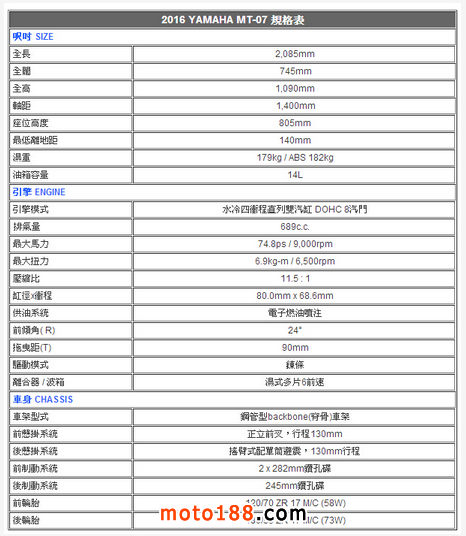 MT系列,已經成功YAMAHA新一代的街車代名詞,系列有MT-125、MT-03、MT-07、MT-09、MT-09 TRACER及剛於意大利車展發布的全新MT-10,系列車型適合不同級別的騎士駕駛。今次,極愛市場歡迎的2016 Yamaha MT-07新車抵港,車款的裝備、規格與2015版完全相同,但采用了灰銀最新色彩的車身及前後螢色黃輪框,沉實的色彩與極搶眼的螢色黃結合,配色相當特別。
