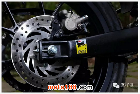 后制動:218mm單盤單卡鉗,制動力道不錯。剎車抱死,來點(diǎn)漂移,是不錯的玩法。