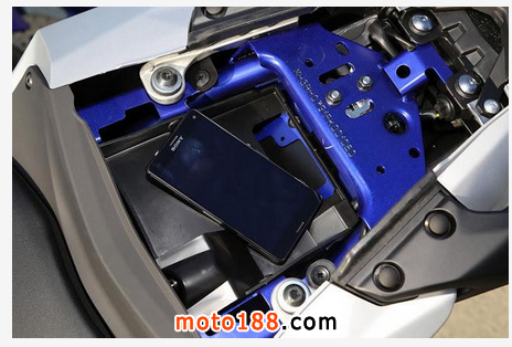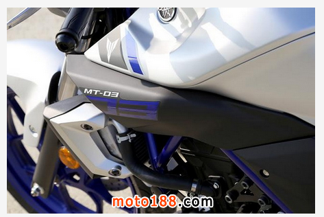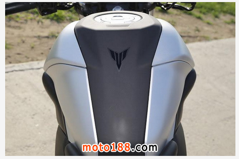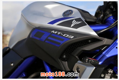 少了整流罩,發(fā)動(dòng)機(jī)和車(chē)架成為了MT-03 造型的一部分,刻意裸露出的車(chē)架,使用與輪框相同的藍(lán)色烤漆,強(qiáng)化了MT-03 在機(jī)械結(jié)構(gòu)的美感。在車(chē)殼部分,為了營(yíng)造出更緊湊且?guī)в屑∪飧械囊庀?,MT-03的油箱外罩變得比R3 更大,并帶有交叉曲線的造型,讓油箱造形變得更霸氣。油箱頂部稍微增加的高度也讓視覺(jué)的重心更為集中,凸顯出更強(qiáng)烈的街車(chē)性格。