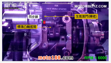 ●低於6,000rpm時(shí),即低及中轉(zhuǎn)使用標(biāo)準(zhǔn)凸輪搖臂及標(biāo)準(zhǔn)凸輪開啟生氣氣門。