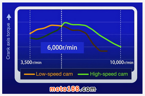 ●圖表顯示引擎低於6,000rpm時(shí)使用標(biāo)準(zhǔn)凸輪,可是引擎升至約5千多轉(zhuǎn)後馬力開始下降,當(dāng)轉(zhuǎn)數(shù)升上6,000rpm後高角度凸輪隨即介入,延伸尾段馬力輸出。