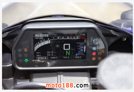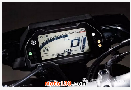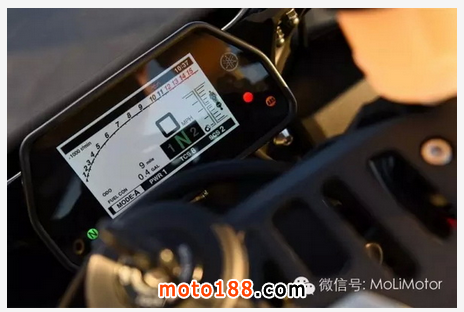 制動則沒有延用R1 新的雙子星卡鉗,而是與MT-09 同樣的對四雙子星卡鉗搭配320mm 雙碟,當然因應歐盟法規,ABS 也是標準配備。另外也搭載類似R1 的大型液晶儀表,能顯示包括轉速、時速、油表、里程、文件位等訊息,做為熱血車款,同樣具備換檔指示燈,并可因車主需要設定閃爍的轉速。